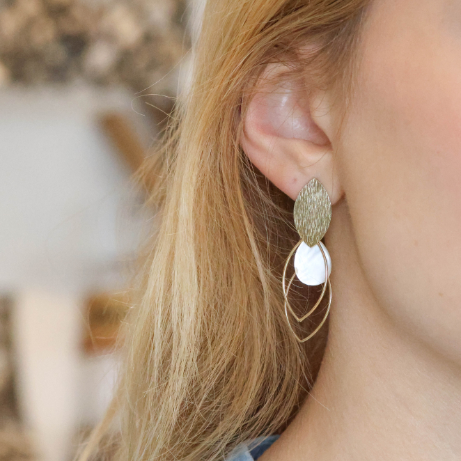 Illuminez vos coiffures de ces boucles d'oreilles pendantes Liliane. Légères et élégantes, elles brillent selon la lumière et embellissent tous vos looks. La couleur du métal doré et de la nacre blanche en font un accessoire intemporel.