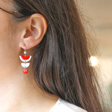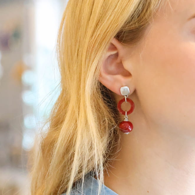 Découvrez les boucles d’oreilles Linette, une palette de profondeur et de douceur. Leurs perles en céramique bordeaux, mariées à des anneaux en plexiglas rouge et en métal argenté, rappellent la richesse des couchers de soleil et l’authenticité des pièces artisanales. Un bijou qui apporte une touche chaleureuse et raffinée à votre style.