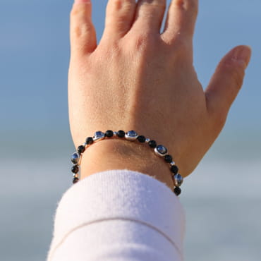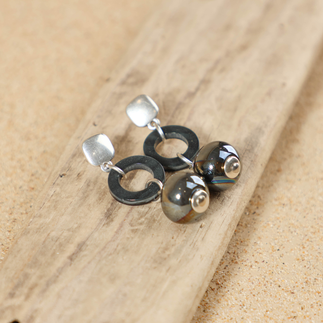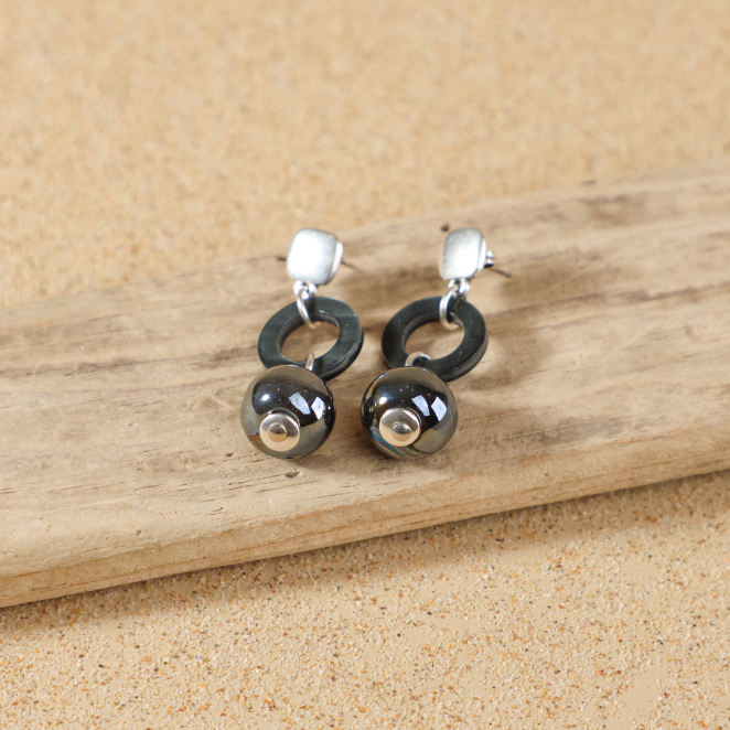 Découvrez les boucles d’oreilles Linette, une alliance de contraste et de lumière. Leurs perles en céramique noire, sublimées par des anneaux en plexiglas noir et en métal argenté, captent l’éclat des nuits étoilées et la pureté des créations artisanales. Un bijou qui apporte une élégance intemporelle et lumineuse à votre style.