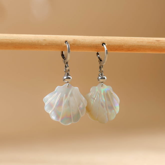 Laissez-vous charmer par nos boucles d’oreilles Liora délicates, où un pendentif en forme de coquillage blanc en nacre rencontre une petite perle argentée. Légères et lumineuses, elles rappellent les trésors ramassés sur le sable et apportent une touche de douceur à votre look. Un bijou artisanal pour évoquer l’esprit des vacances au bord de l’eau.