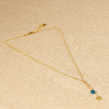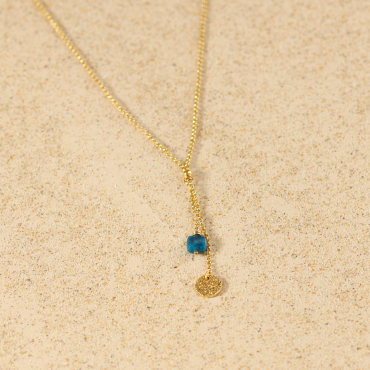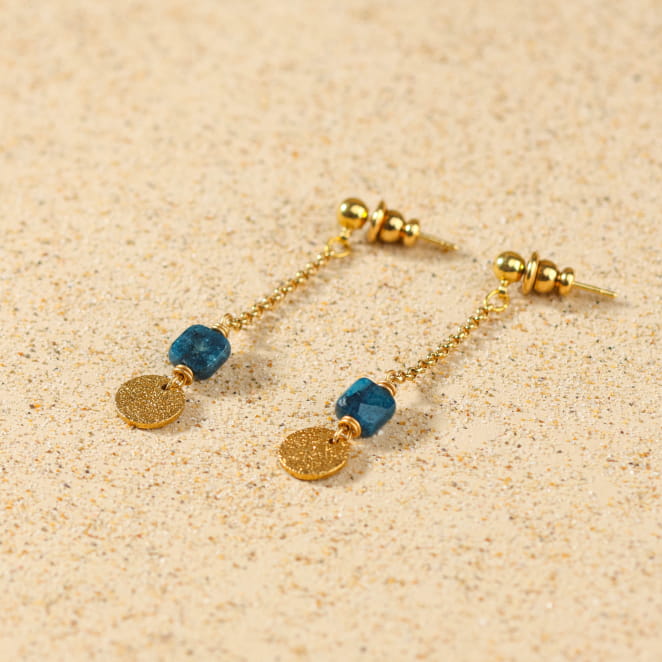 Inspirez-vous avec les boucles d'oreilles bleu Lumineuse. Ces bijoux arborent un pendentif bleu vibrant, orné d'une délicate pastille dorée suspendue au bout d'une chaînette dorée. L'association du bleu et de l'or crée un contraste saisissant, ajoutant une touche de sophistication à votre tenue. Les boucles d'oreilles parfaites pour briller en toute occasion.