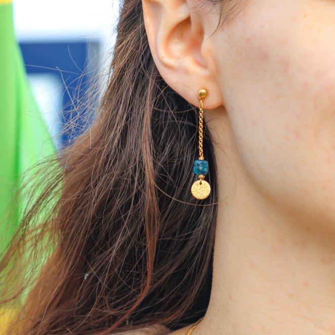 Inspirez-vous avec les boucles d'oreilles bleu Lumineuse. Ces bijoux arborent un pendentif bleu vibrant, orné d'une délicate pastille dorée suspendue au bout d'une chaînette dorée. L'association du bleu et de l'or crée un contraste saisissant, ajoutant une touche de sophistication à votre tenue. Les boucles d'oreilles parfaites pour briller en toute occasion.