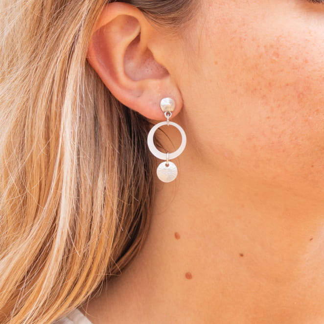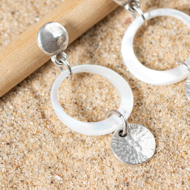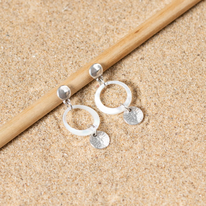 Les boucles d'oreilles Mellita ajoutent éclat et originalité à vos looks. Argentées, elles se composent d'un anneau en nacre blanche qui reflète la lumière, suspendant un pendentif rond en métal argenté. Parfaites pour illuminer votre style avec une touche unique et sophistiquée, ces boucles sont un choix idéal pour toutes les occasions.