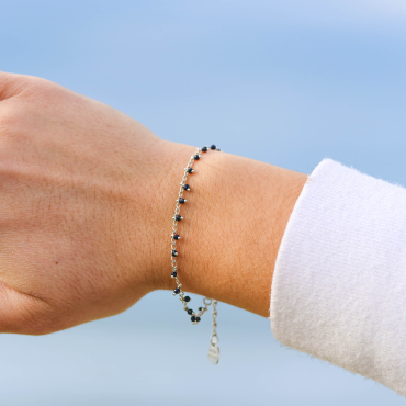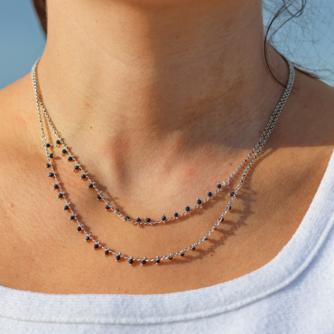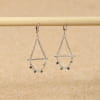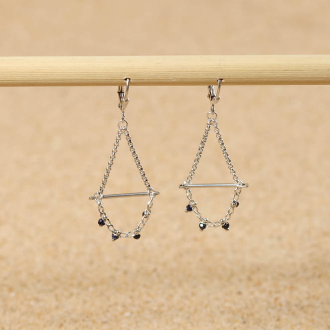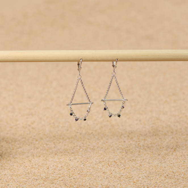 Apportez une touche de mouvement et de lumière avec la paire de boucles d’oreilles argentées, Mesange. Une première chaîne fine encadre un connecteur bâton, prolongé par une seconde chaîne souple ponctuée de perles en pierre de sable bleu marine. Une silhouette légère et fluide, qui capte la lumière à chaque mouvement.