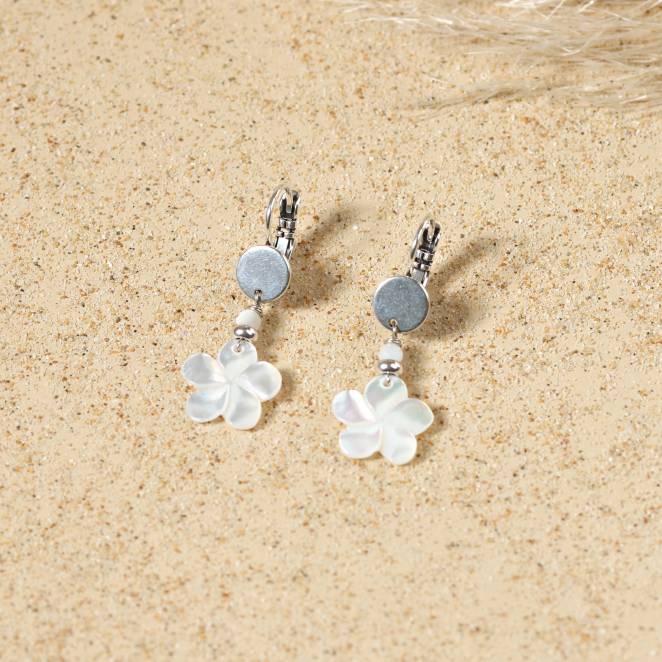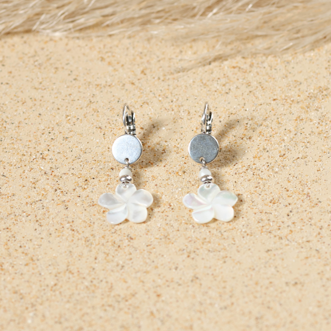Découvrez ces boucles d'oreilles pour femme en nacre et argent, alliant la douceur des reflets naturels et l’authenticité des matériaux, pour une touche d’évasion et de lumière.