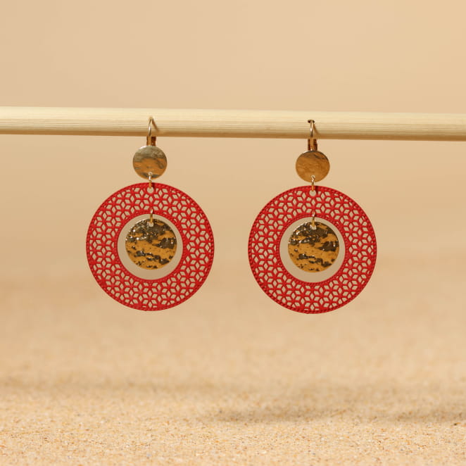 - un pendentif rond en métal rouge,
