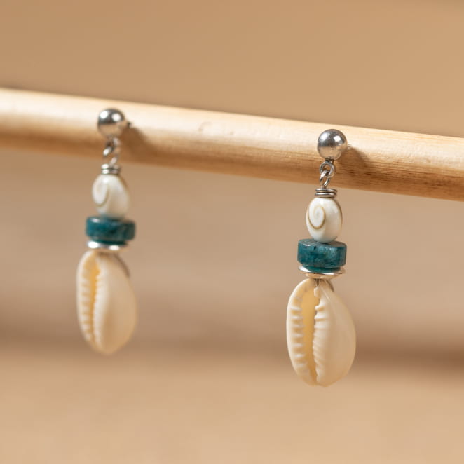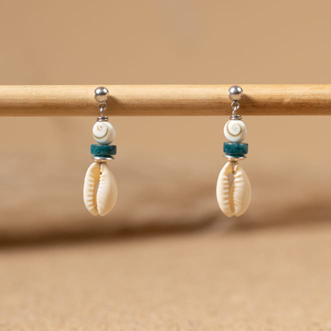 Embarquez pour un voyage au bord de l'eau avec les boucles d'oreilles Mina. Véritable hommage à la mer et aux vacances, elles se parent d'un coquillage cauri, d'un œil de Saint Lucie et d'une pierre bleue en apatite. Chaque élément raconte une histoire de plage et de moments précieux sous le soleil. Symbole de chance et de protection, l'œil de Saint Lucie évoque les trésors trouvés lors de balades sur la plage. Cette paire de boucles d'oreilles femme, fabriquée en France avec soin, apporte une touche de poésie à vos oreilles. Sentez la brise marine et laissez-vous emporter par leur charme élégant !