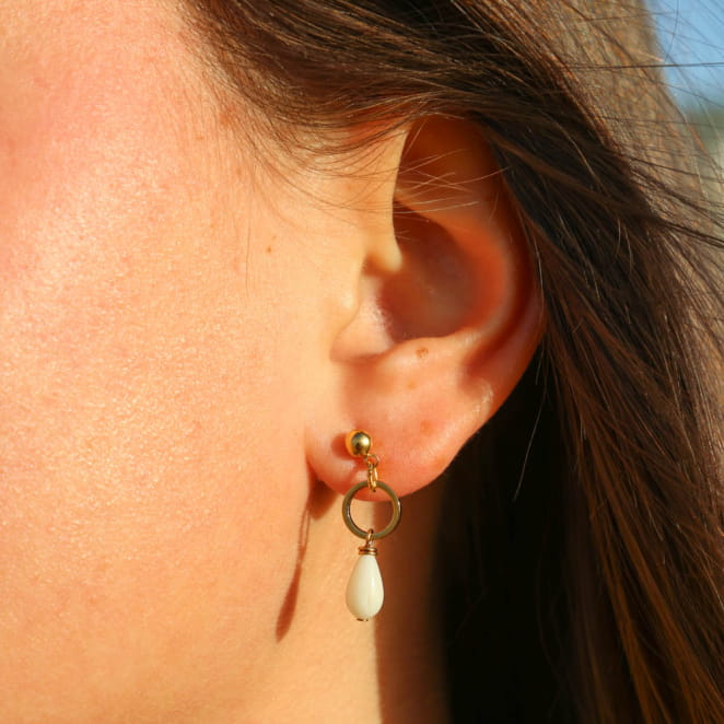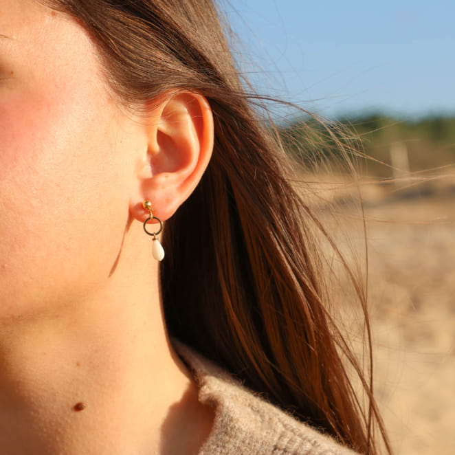 Adoptez un style raffiné avec les boucles d'oreilles Mini pour femme ! Ce bijou fantaisie se compose de pendentifs goutte en aragonite blanche sur des cercles dorés. Discrètes et élégantes, ces petites boucles d'oreilles apportent une touche délicate à votre look quotidien.