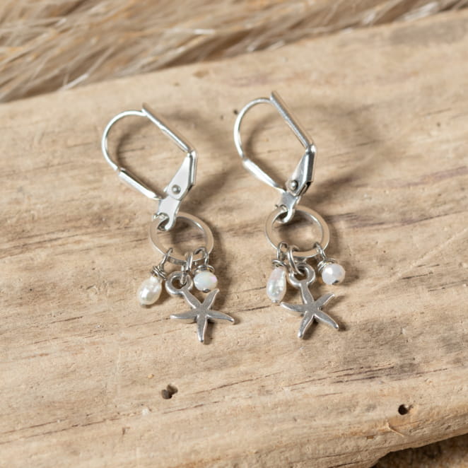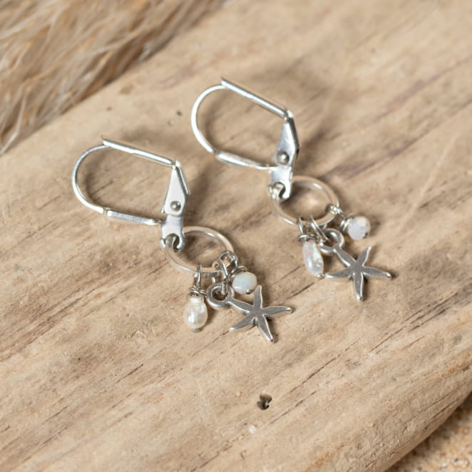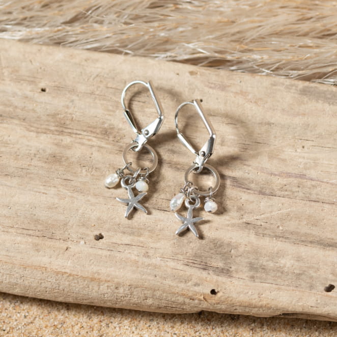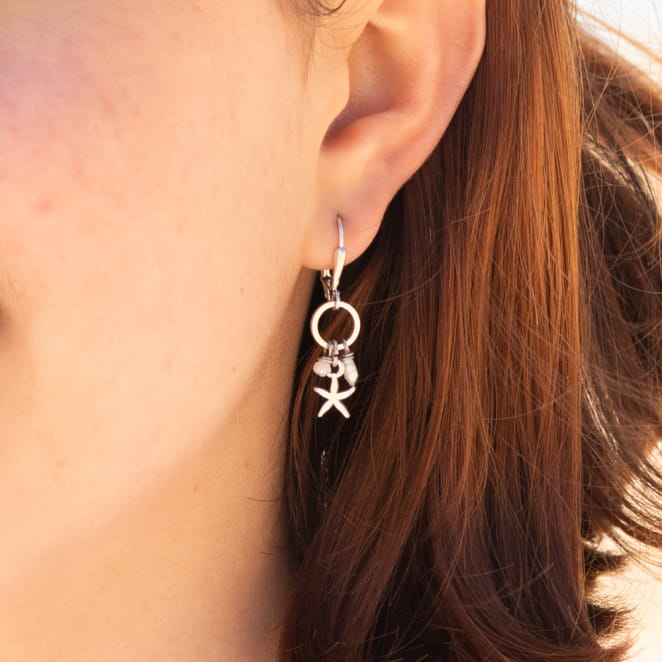 Découvrez l'élégance discrète des boucles d'oreilles Minorque. Composées d'un pendentif cercle et d'un pendentif étoile de mer, elles sont ornées de perles en nacre et de perles en verre blanc. Leur finesse et leur discrétion en font des accessoires parfaits pour toute occasion.
