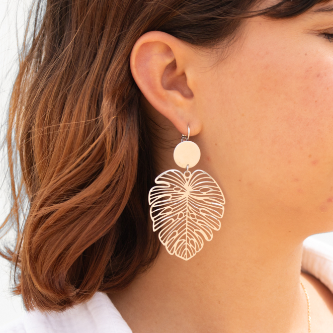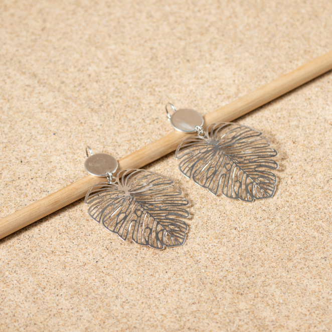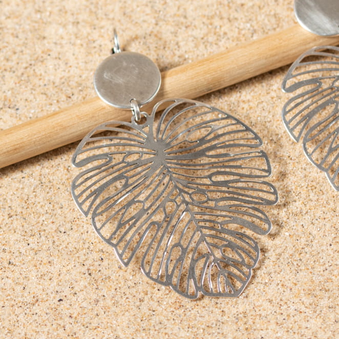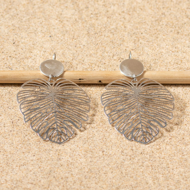 Découvrez les boucles d'oreilles Mumbo : des pendentifs en forme de feuilles argentées qui captivent par leur élégance naturelle. voir plus