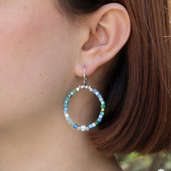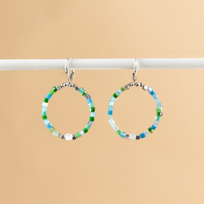 Découvrez les boucles d'oreilles Murzo, des créoles argentées qui illuminent votre visage : ornées de perles cubes en verre aux nuances bleu-vert et d'une perle en nacre blanche, elles ajoutent couleur et éclat à votre teint. voir plus