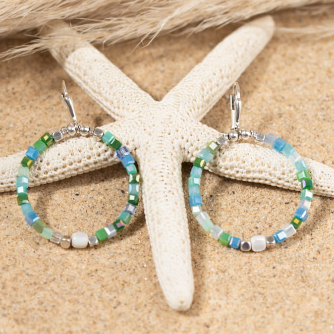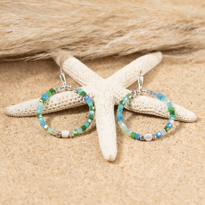 Découvrez les boucles d'oreilles Murzo, des créoles argentées qui illuminent votre visage : ornées de perles cubes en verre aux nuances bleu-vert et d'une perle en nacre blanche, elles ajoutent couleur et éclat à votre teint. Un accessoire élégant pour sublimer votre look en toute occasion !