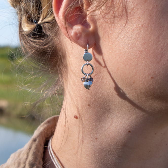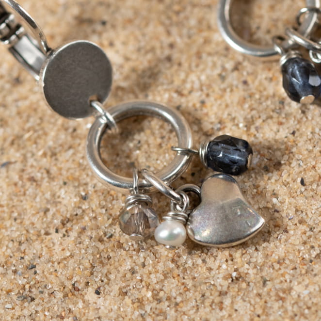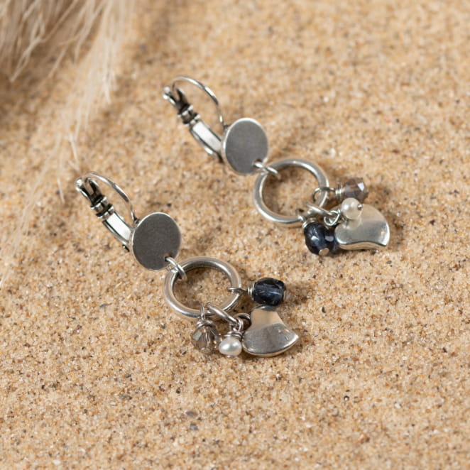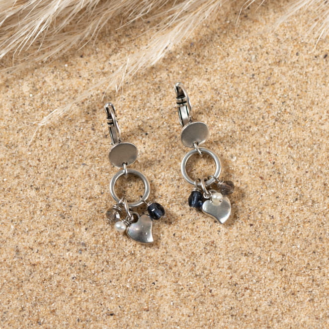 Découvrez l'élégance intemporelle des boucles d'oreilles Mutti. Ornées de perles en verre bleu et beige, ces bijoux argentés captivent par leur finesse. Leur charme est sublimé par des pendentifs en forme de cœur argenté, ajoutant une touche romantique à toute tenue. Complétez votre parure avec le collier et le bracelet assortis de la collection Mutti.