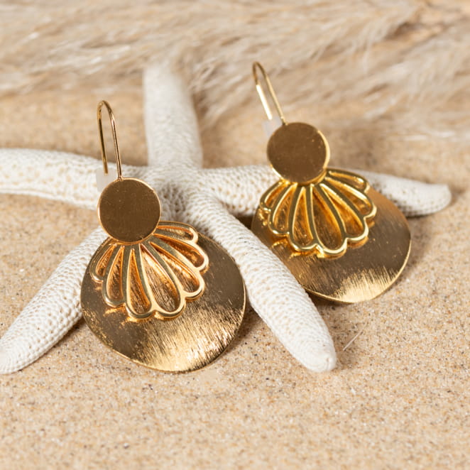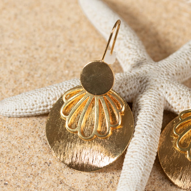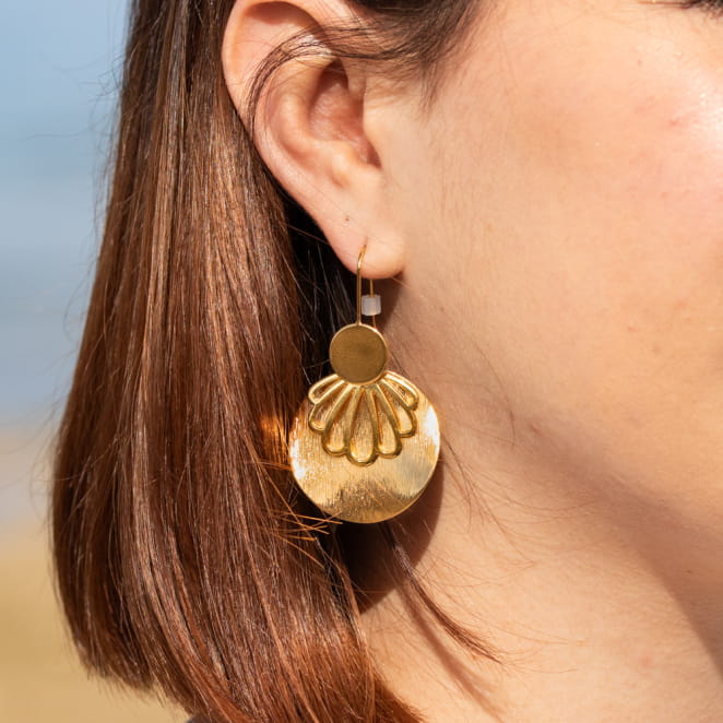 Les boucles d'oreilles Nadege évoquent le bord de mer avec leur pendentif en forme de coquillage. Composées également d'une pièce ronde en métal doré, elles reflètent la lumière pour illuminer votre visage. Idéales pour un look lumineux et élégant, elles ajoutent une touche marine à votre style.