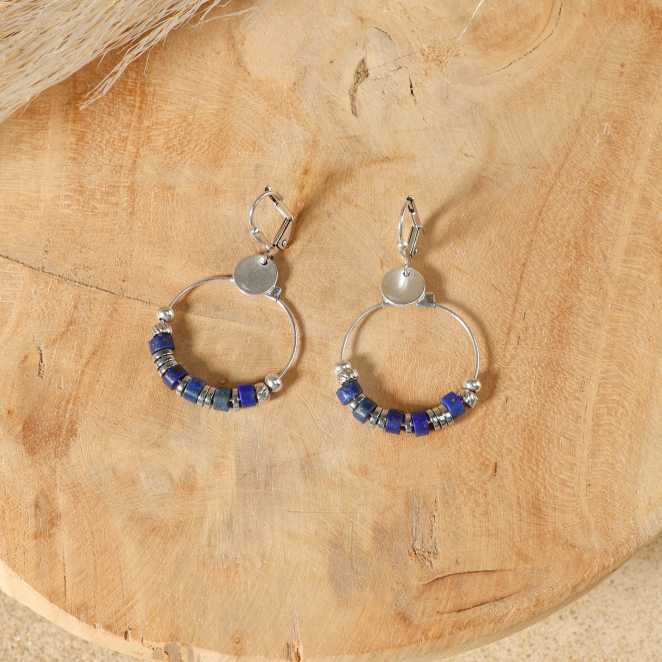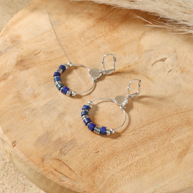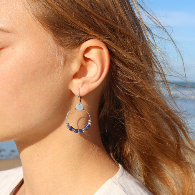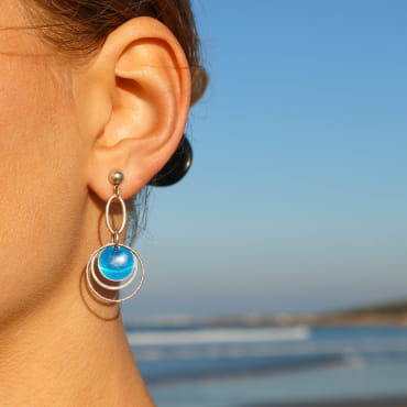 Captivez la délicatesse de l'océan avec les boucles d'oreilles Naïma pour femme, grâce à ses perles en pierre bleue, elles vous transportent au bord de mer de la côte Ouest. Ces fines dormeuses et perles argentées apportent à ces pièces éclat et raffinement, les créoles apportent mouvement à votre visage.