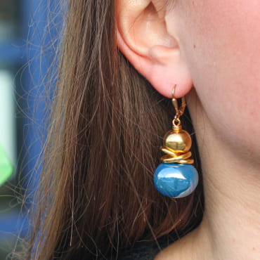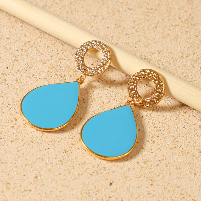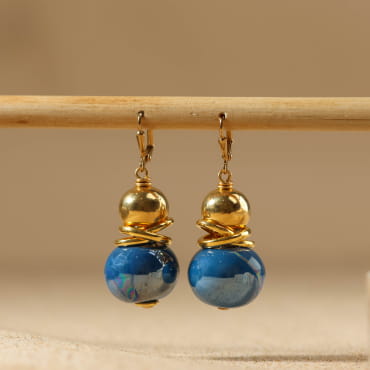 Retrouvez les boucles d’oreilles Neha, un bijou artisanal qui capture l’essence des moments passés près de l’eau. Leurs anneaux dorés à l’or fin 24K et leur pendentif goutte en émaille bleu éclatant évoquent la vitalité des reflets sur l'océan. Fabriquées avec soin en France, ces boucles d’oreilles allient simplicité et raffinement, pour un accessoire qui s’accorde à toutes vos envies d’évasion et de lumière.