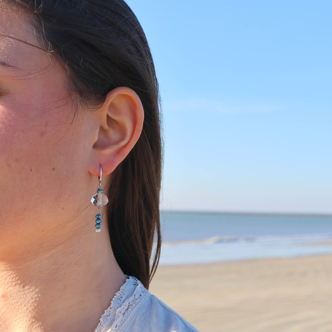Craquez pour notre paire de boucles d'oreilles pour femme Nelsie : une création artisanale qui se compose de perles en verre bleues, d'une perle en verre transparente, et d'une petite perle en métal plaqué argent 999. Ces boucles d'oreilles en perles pour femme sont parfaites pour ajouetr une touche scintillante à votre tenue !