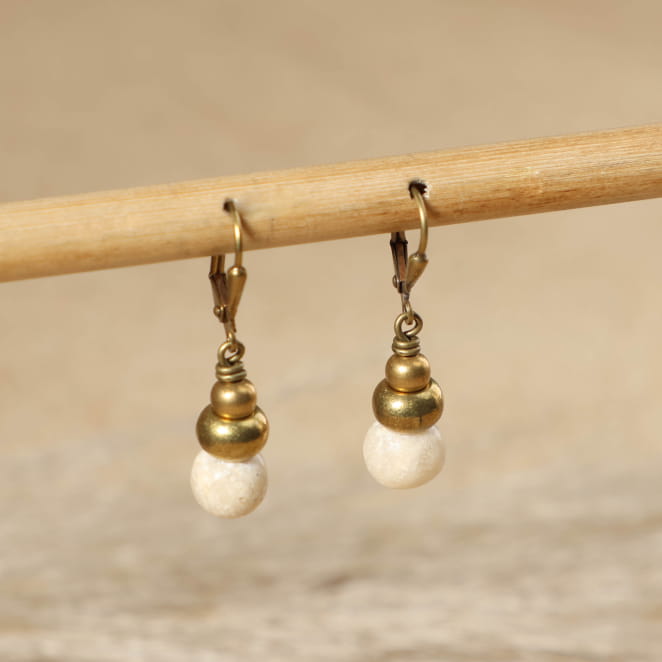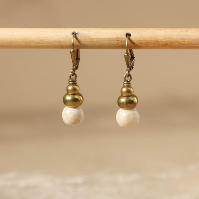 Retrouvez l’esprit nature avec ces boucles d'oreilles Noham, où la douceur des perles en pierre blanche et en métal bronze se marie à la légèreté des dormeuses. Elles évoquent le sable des plages, ces boucles apportent une touche lumineuse et artisanale à votre tenue.