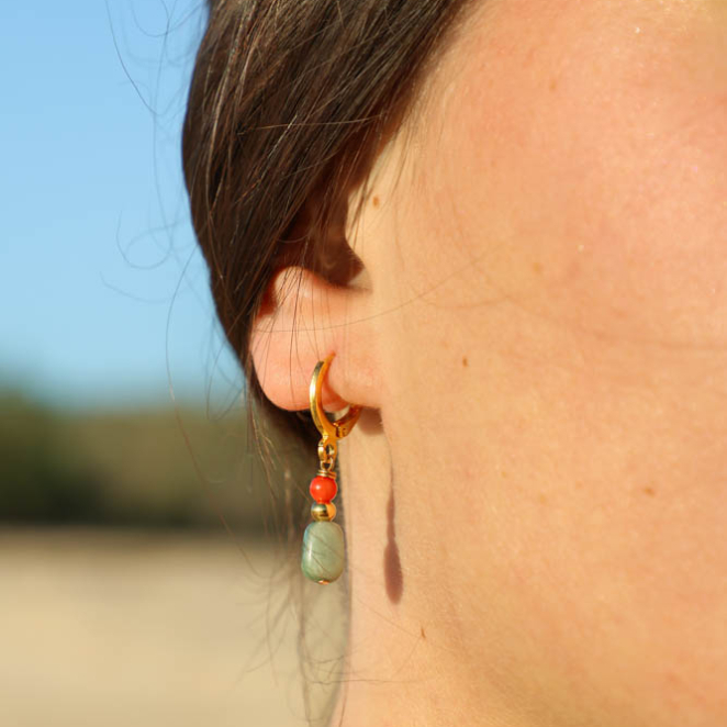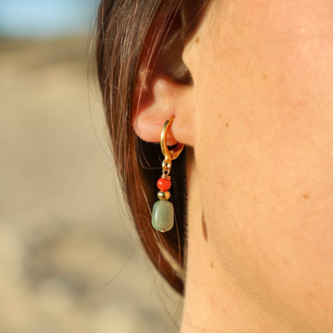 Apportez une touche de douceur naturelle à vos tenues avec les boucles d'oreilles Nomia. Montées sur un anneau doré lumineux, elles se parent d’une perle de corail éclatante et d’une perle de jaspe kaki subtilement nuancée. Ce duo de couleurs, à la fois raffiné et organique, évoque la richesse des paysages côtiers et la beauté brute des éléments. Légères et intemporelles, ces boucles d'oreilles se marient aisément avec vos looks du quotidien ou vos occasions spéciales. Une élégance discrète qui fait toute la différence.