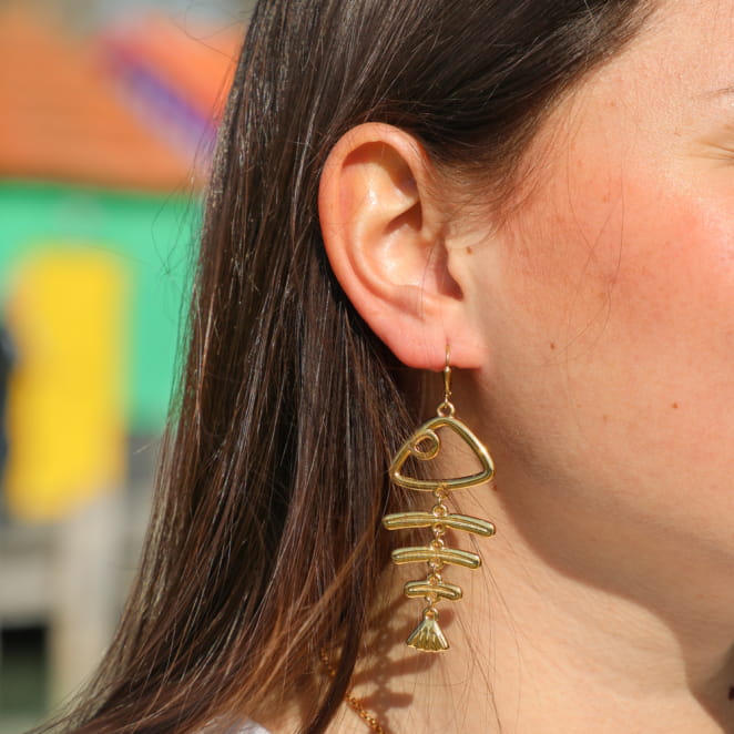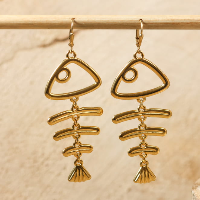 Craquez pour les boucles d'oreilles Noumea dorées, des incontournables de notre collection qui capturent la fraîcheur et l'originalité des vacances en bord de mer. Ces boucles d'oreilles sont un hommage aux trésors marins, avec leur pendentif en forme de poisson articulé qui symbolise à la fois l'authenticité et la beauté brute de la nature. Leur design unique et délicat vous permettra d’afficher un style résolument moderne, tout en apportant une touche de sophistication à votre tenue. Ces boucles d'oreilles femme Noumea, à la fois intemporelles et audacieuses, se distinguent par leur singularité, parfaites pour les femmes en quête d'originalité !