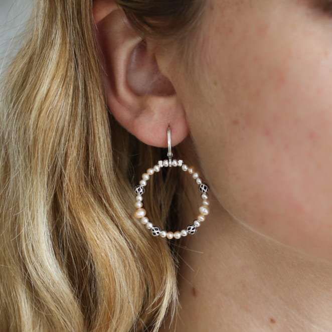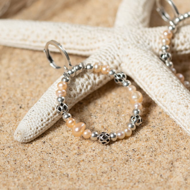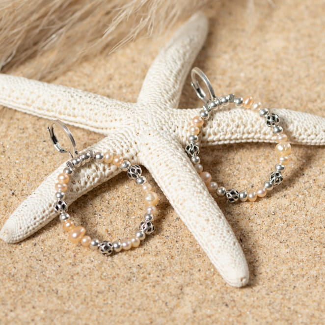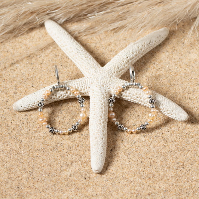 Découvrez la subtile élégance des boucles d'oreilles Odélia. Ces créoles sont ornées de multiples perles argentées et de perles de rivière saumon, offrant une touche délicate de couleur et de brillance. Complétez votre look avec la parure comprenant le bracelet et le collier assortis pour une sophistication discrète.
