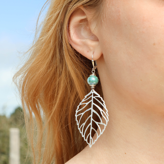 Laissez-vous porter par l’esprit nature avec ces boucles d’oreilles Oona, où le vert et l’argenté s’unissent pour un style apaisant. Ce bijou artisanal, orné de céramique et de feuilles argentées, évoque l’évasion et le fait main. Parfaites pour celles qui aiment les accessoires lumineux et inspirés par la nature, ces boucles apportent une touche de bord de mer à chaque instant.