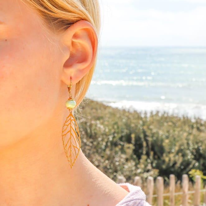 Laissez-vous porter par l’esprit nature avec ces boucles d’oreilles Oona, où le vert pastel et le doré s’unissent pour un style apaisant. Ce bijou artisanal, orné de céramique et de feuilles dorées à l'or fin 24K, évoque l’évasion et le fait main. Parfaites pour celles qui aiment les accessoires lumineux et inspirés par la nature, ces boucles apportent une touche de bord de mer à chaque instant.