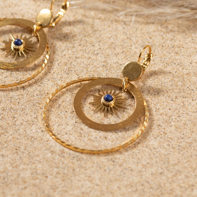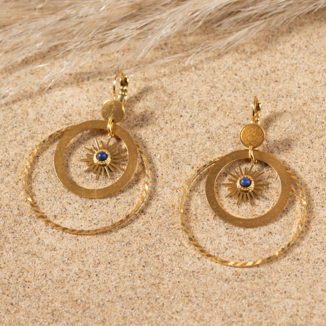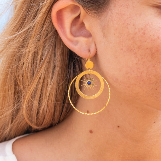 Les boucles d'oreilles Ophélie rayonnent comme un soleil d'été. Composées de plusieurs anneaux dorés, elles mettent en avant un pendentif en forme de soleil ajoutant une subtil touche de couleur grâce à sa perle bleu dur au centre. Cette jolie paire illumine votre look, apportant chaleur et éclat en toute saison.