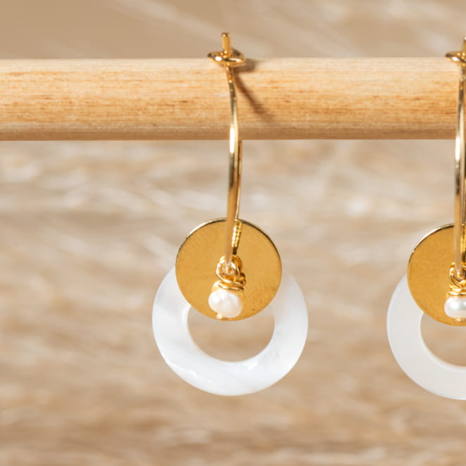 Éclatantes, les boucles d'oreilles fantaisie Orvieto allient chic et légèreté ! Conçues avec une petite créole dorée, une plaque de perle en nacre et une perle dorée, elles incarnent l'élégance discrète. Légères comme une brise marine, ces bijoux apportent une touche moderne à votre tenue.
