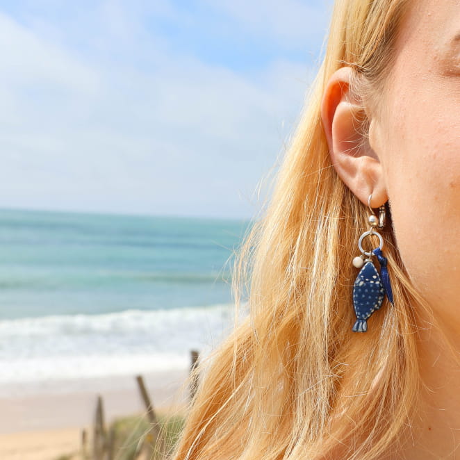 Laissez-vous porter par les boucles d'oreilles Oscar bleu marine, la où les dormeuses argentées et les perles en nacre de beniter blanches illuminent les pendentifs poissons en céramique bleu marine évoquent les trésors cachés de l’océan.