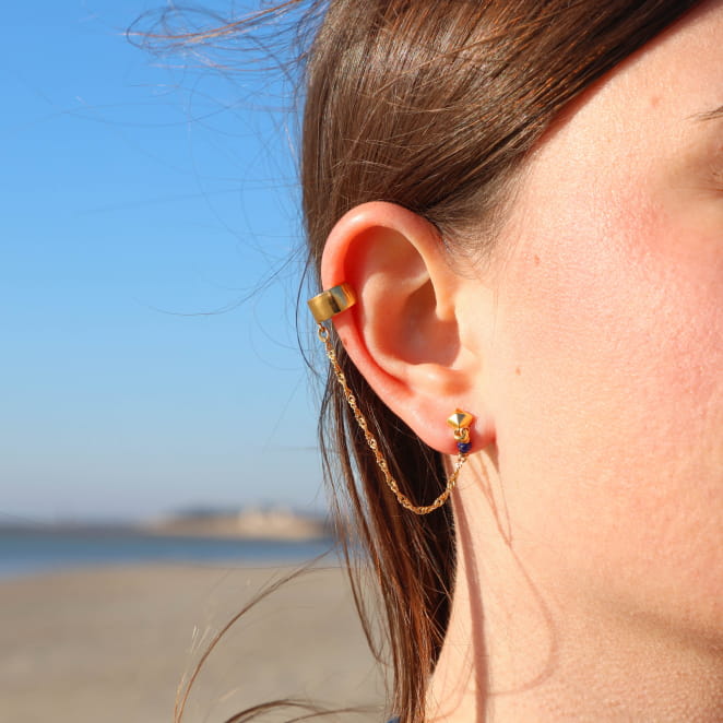Affirmez votre style avec Outremer, une boucle d’oreille earcuff unique et originale ! Cette création associe une boucle dorée classique, à porter dans un lobe percé, et un earcuff relié par une chaîne fine et délicate. Pas besoin de deuxième trou : l’earcuff se fixe grâce à une bague ajustable, créant l’effet d’un faux piercing élégant et tendance ! Légère et confortable, cette boucle joue sur l’équilibre parfait entre audace et sophistication. Une touche de couleur bleu dur vient égayer l’ensemble, ajoutant une note bohème et artistique à ce bijou captivant. Fabriquée à la main en France, cette boucle est idéale pour celles qui aiment se démarquer, avec des pièces artisanales et uniques. Sa conception ingénieuse permet de la porter facilement tout au long de la journée, grâce à son design original ! Adoptez une pièce pleine de caractère et de modernité, où chaque détail raconte une histoire d’artisanat et de créativité.
