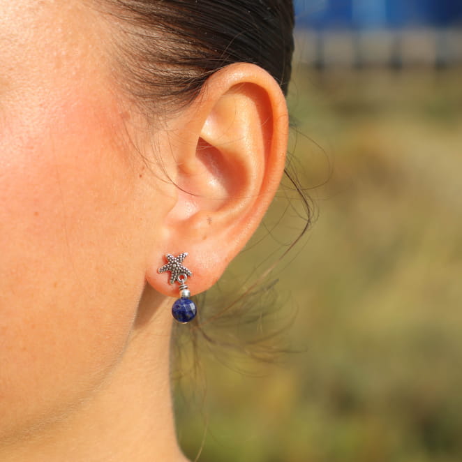 Misez sur la sobriété élégante avec les boucles d'oreilles, Patti. Montées sur un clou en forme d’étoile en métal plaqué argent 999, elles sont ornées d’une perle en sodalite bleue, pierre naturelle aux nuances profondes et uniques. Leur design simple et raffiné en fait un bijou facile à assortir, que ce soit pour compléter une tenue décontractée ou habillée. Légères et confortables, elles ajoutent une touche de couleur subtile et de caractère à votre style.