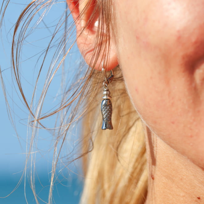 Adoptez les boucles d'oreilles fantaisie Pêcheur pour un look marin élégant ! Les pendentifs argentés en forme de poisson sont en hématite argent. Les petites perles ajoutent une touche de fraîcheur et de sophistication !