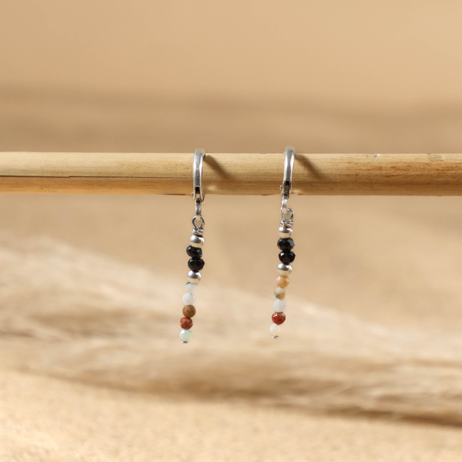Plongez dans l’univers envoûtant de ces boucles d’oreilles pour femme en perles : Pertuis, où les perles en pierre multicolore évoquent les reflets changeants de la mer, tandis que le verre noir et l'argenté rappellent la douceur des nuits étoilées sur la côte. Un bijou artisanal, à la fois moderne et intemporel, pour sublimer chaque instant avec une touche délicate d’élégance.