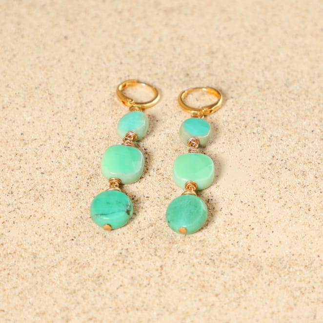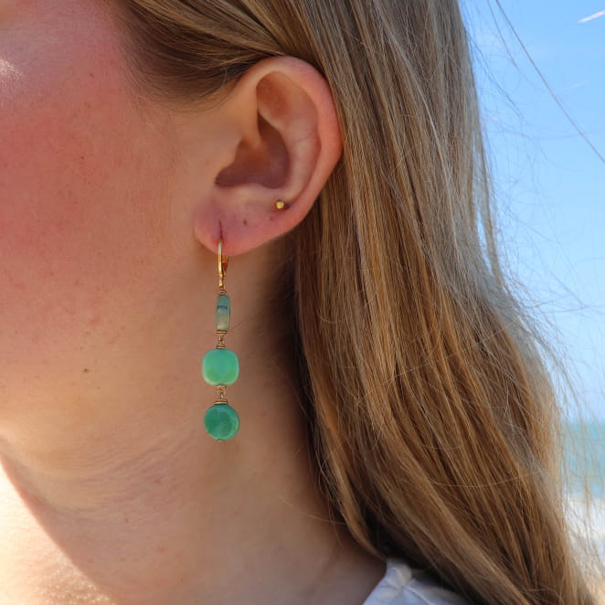 Retrouvez notre paire de boucles d'oreilles en perles naturelles Phyton. Ce bijou séduit grâce à l'éclat minéral des perles vertes qui apportent une touche raffinée et délicate. Ces boucles d'oreilles pour femme reflètent les jolies couleurs du bord de mer, les nuances de l'océan.