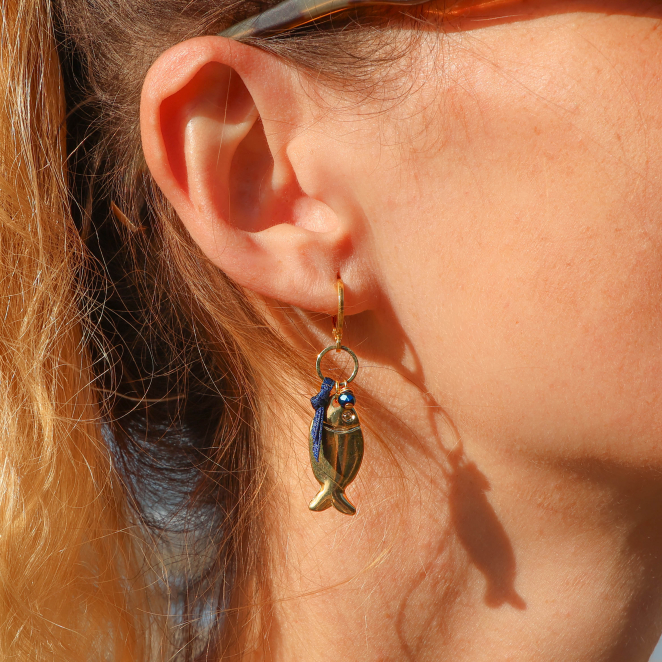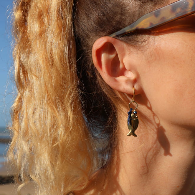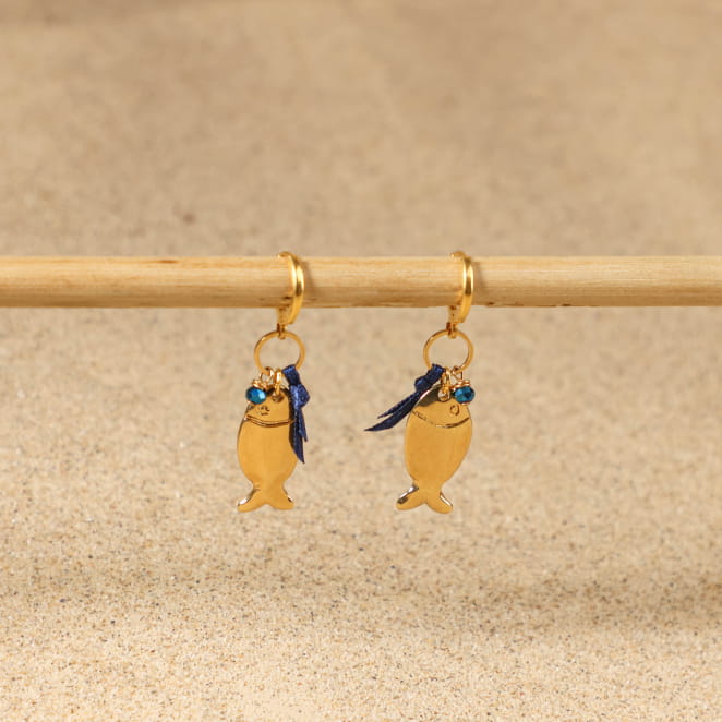 Découvrez nos boucles d'oreilles pour femme Piscine qui apportent une touche du bord de mer à votre style. Le pendentif en forme de poisson doré symbolise l’univers marin, tandis que le ruban bleu et la perle en verre bleu marine rappellent les reflets profonds de l’océan. Légères et pleines de caractère, ces boucles d'oreille spour femme illuminent votre visage avec élégance et originalité.