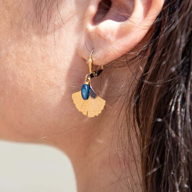 Adoptez l'élégance naturelle avec les boucles d'oreilles Plante. Des pendantes au charme délicat, ornées d'un pendentif feuille doré et d'une perle ovale en nacre bleu. Un équilibre parfait entre simplicité et raffinement pour sublimer votre style avec une touche végétale sophistiquée.