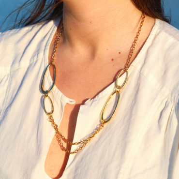 Découvrez nos boucles d'oreilles Prague, une création lumineuse où s’entrelacent des anneaux dorés Ces boucles apportent une touche géométrique et raffinée à votre tenue, idéales pour sublimer vos journées ensoleillées ou vos soirées estivales. Ce bijou évoque la douceur des reflets chauds du soleil sur la plage.