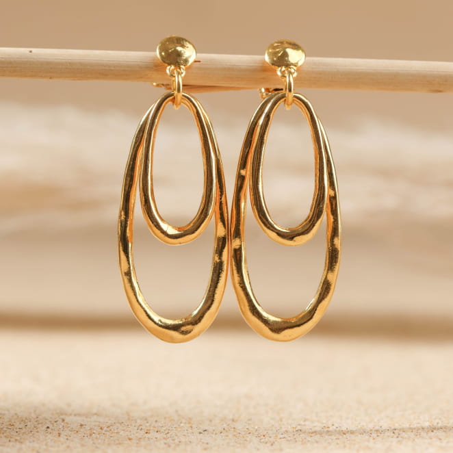 Découvrez nos boucles d'oreilles Prague, une création lumineuse où s’entrelacent des anneaux dorés Ces boucles apportent une touche géométrique et raffinée à votre tenue, idéales pour sublimer vos journées ensoleillées ou vos soirées estivales. voir plus