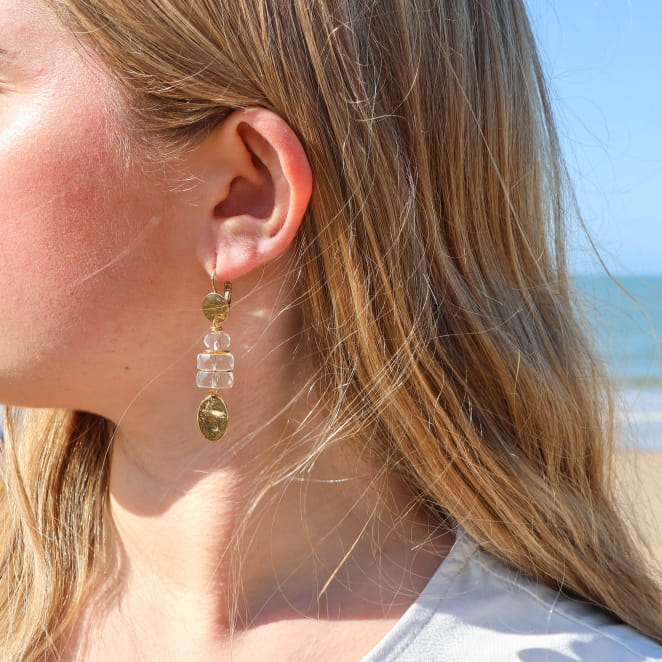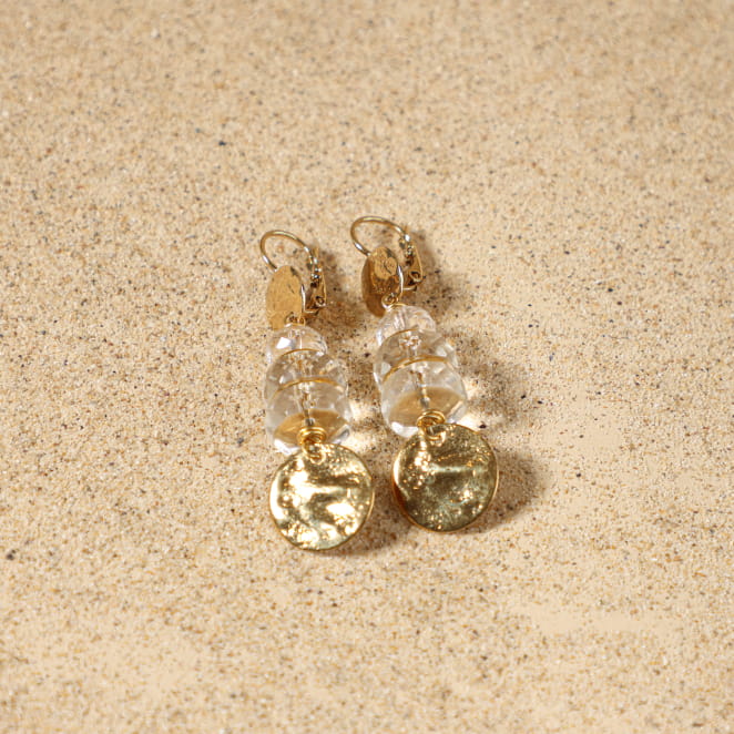 Découvrez nos boucles d'oreilles Rococo qui allient la douceur et la lumière dans un style raffiné et intemporel. Leurs pendentifs ronds dorés se marient à des perles de verre transparentes et lumineuses laissant refleter les éclats du soleil et à de délicates perles plates dorées. Légères mais affirmées, elles apportent une touche chic et solaire à toutes vos tenues, du quotidien aux occasions plus habillées.