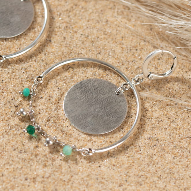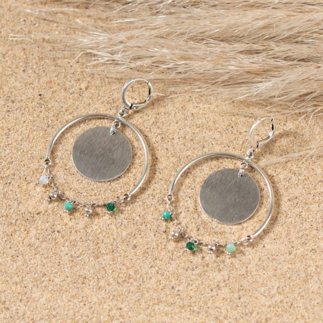 Illuminez votre look avec les boucles d'oreilles Ronde. Ces imposantes pendantes, avec leurs pièces métalliques argentées et leur chaîne ornée de perles en verre vert, apportent éclat et couleur à votre teint. Parfaites pour une touche de sophistication et de charme à vos tenues.
