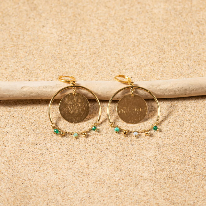 Illuminez votre look avec les boucles d'oreilles Ronde. Ces imposantes pendantes, avec leurs pièces métalliques dorées et leur chaîne ornée de perles en verre vert, apportent éclat et couleur à votre teint. Parfaites pour une touche de sophistication et de charme à vos tenues.