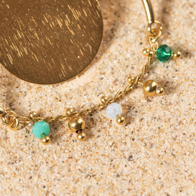 - d'une chaine à grelot en métal doré d'un flash d'or et de perles en verre vert,