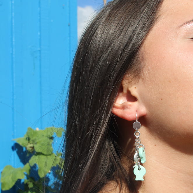 Les boucles d'oreilles Sandre se distinguent par leur originalité et leur charme enfantin. Ornées de perles en céramique poisson couleur vert d'eau, elles apportent une touche de couleur et un style marin décalé à vos ensembles. Parfaites pour ajouter une note ludique et vibrante à votre look, ces boucles égayent toutes vos tenues avec élégance.