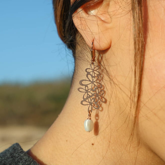 Apportez une touche de finesse à votre look avec les boucles d'oreilles Selena en doré rose, sublimées par un pendentif ajouré orné de petites fleurs délicates. À l’extrémité du pendentif, une perle ronde en nacre vient compléter ce bijou avec une touche de lumière douce et raffinée. Le doré rose apporte une chaleur subtile, tandis que la nacre apporte une touche de fraîcheur et d’élégance. Idéales pour ajouter une note féminine et poétique à vos tenues, ces boucles d'oreilles sont parfaites pour le quotidien comme pour des occasions spéciales.
