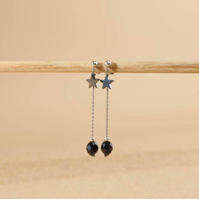 Optez pour notre paire de boucles d'oreilles pour femme Sloane : un délicat bijou artisanal composé d'une fine chaîne plaqué argent 999, de petites perles rondes et en étoile en hématite et d'une perle en agate noir. Cette paire de boucles d'oreilles femme est parfaite pour accompagner vos tenues quotidiennes tout en ajoutant une touche lumineuse et sobre.