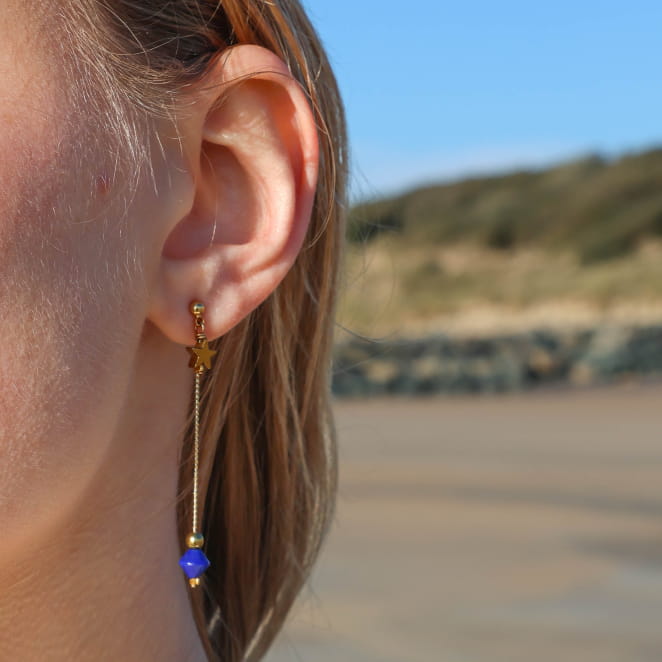 Optez pour notre paire de boucles d'oreilles pour femme Sloane : un délicat bijou artisanal composé d'une fine chaîne doré à l'or fin 24K, de petites perles rondes et en étoile en hématite et d'une perle en lapis lazuli. Cette paire de boucles d'oreilles femme est parfaite pour accompagner vos tenues quotidiennes tout en ajoutant une touche lumineuse et colorée.