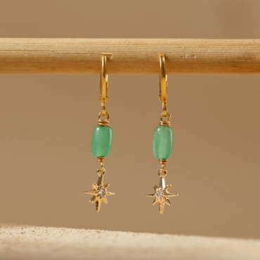 Optez pour notre paire de boucles d'oreilles pour femme Sloane : un délicat bijou artisanal composé d'une fine chaîne doré à l'or fin 24K, de petites perles rondes et en étoile en hématite et d'une perle en aventurine vert. voir plus