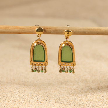 Optez pour notre paire de boucles d'oreilles pour femme Sloane : un délicat bijou artisanal composé d'une fine chaîne doré à l'or fin 24K, de petites perles rondes et en étoile en hématite et d'une perle en aventurine vert. Cette paire de boucles d'oreilles femme est parfaite pour accompagner vos tenues quotidiennes tout en ajoutant une touche lumineuse et colorée.