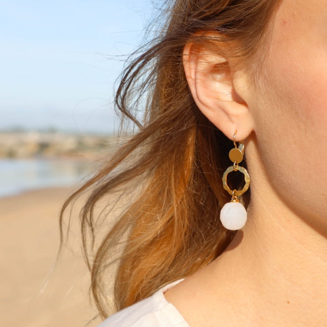 Laissez-vous tenter par la simplicité et la lumière des boucles d’oreilles pour femme Snob, où une perle blanche en verre, est mise en valeur par un anneau doré et légérement ondulé. Ce duo délicat apporte une touche de fraîcheur et de raffinement à votre style. Sa perle blanche, intemporelle et lumineuse, s'équilibre avec l'éclat doré, pour un bijou délicat et sophistiqué.